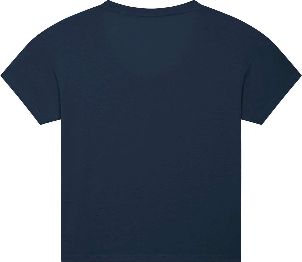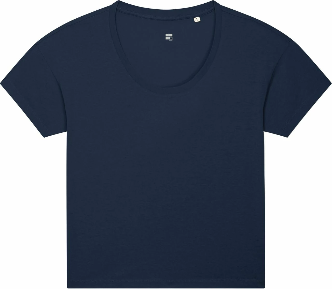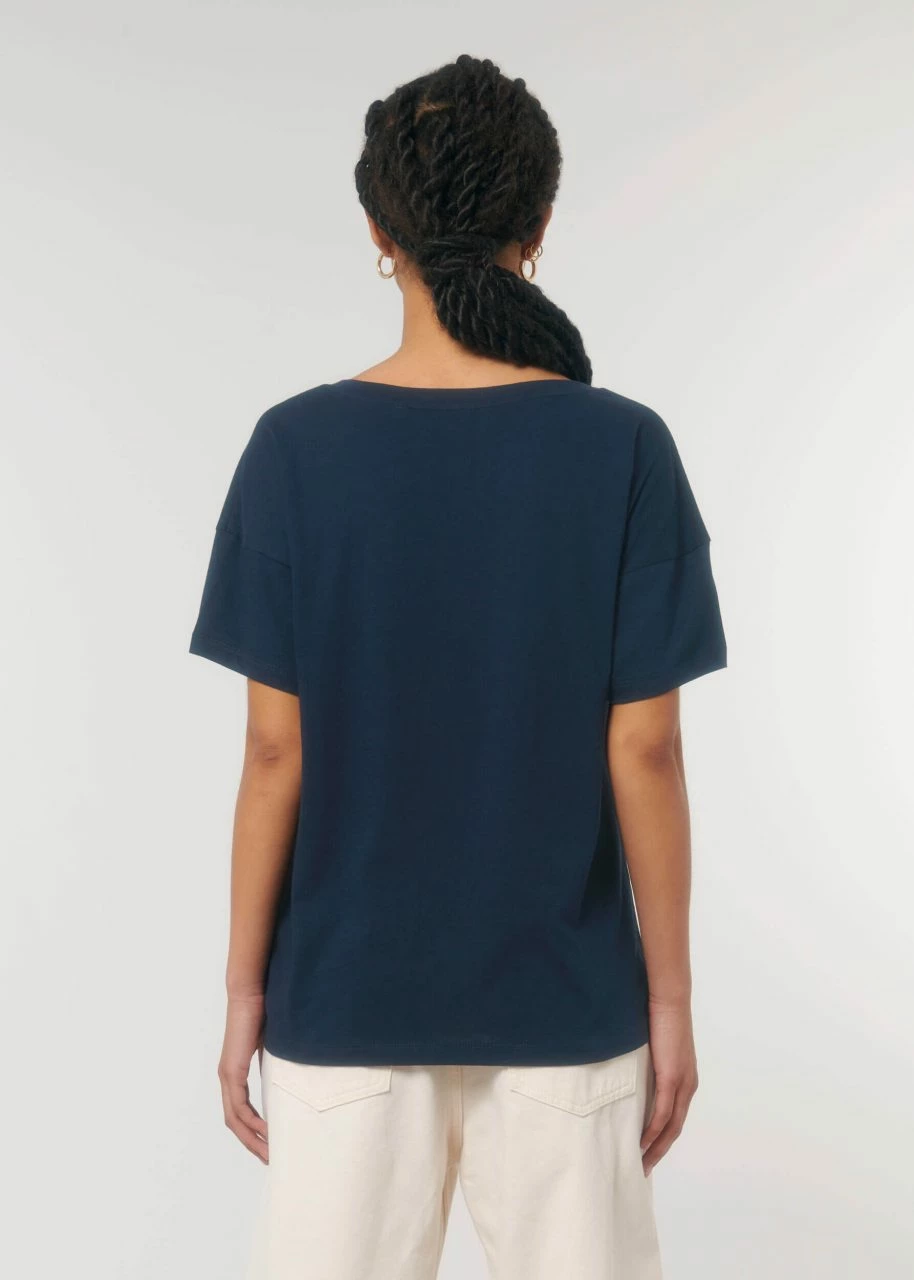 Locker sitzendes T-Shirt aus reiner Bio-Baumwolle. Das Shirt hat einen weiten und geraden Schnitt mit überschnittenen Ärmelansätzen. Der runde, etwas tiefer geschnittene Halsausschnitt ist mit einem feinen Rippbündchen eingefasst. Der Single-Jersey Stoff ist angenehm weich und leicht.