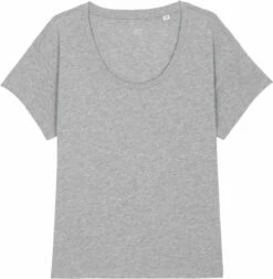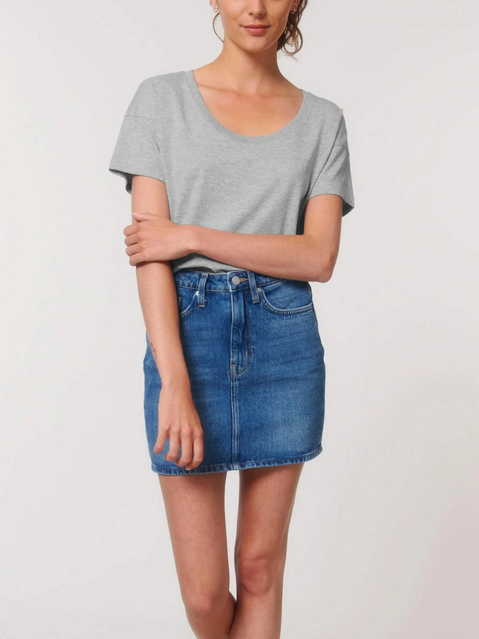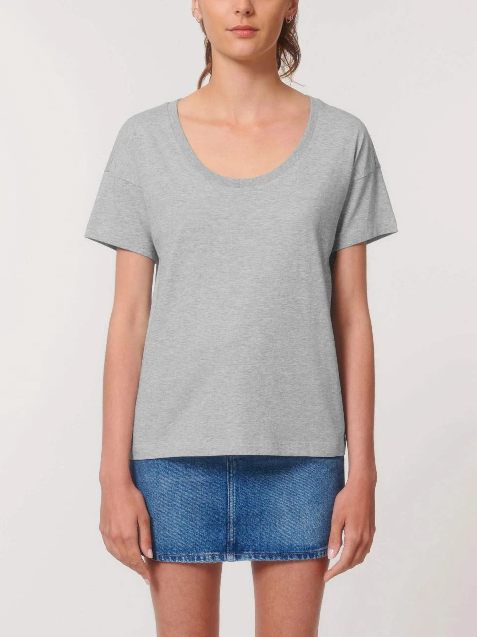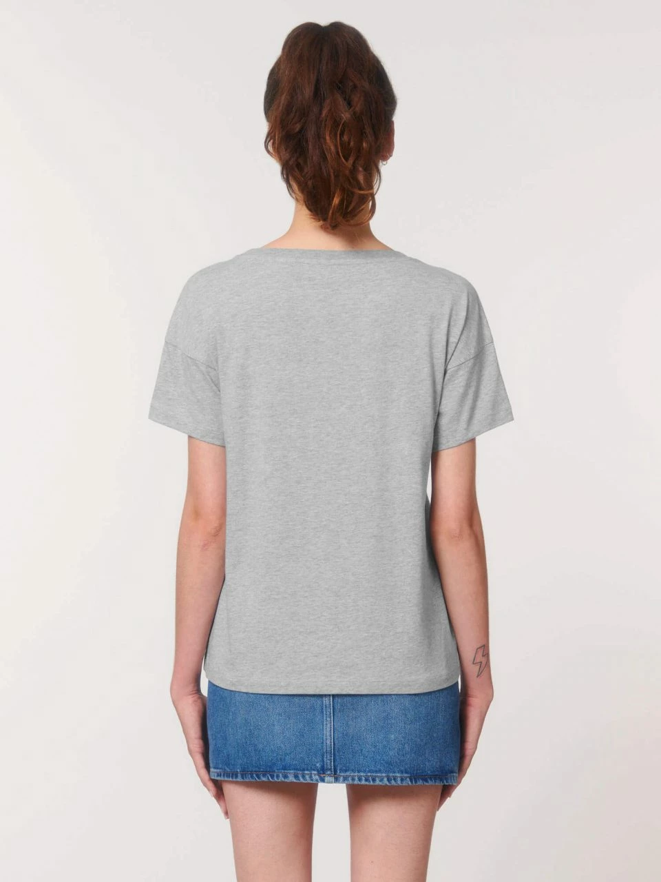Locker sitzendes T-Shirt aus reiner Bio-Baumwolle. Das Shirt hat einen weiten und geraden Schnitt mit überschnittenen Ärmelansätzen. Der runde, etwas tiefer geschnittene Halsausschnitt ist mit einem feinen Rippbündchen eingefasst. Der Single-Jersey Stoff ist angenehm weich und leicht.
