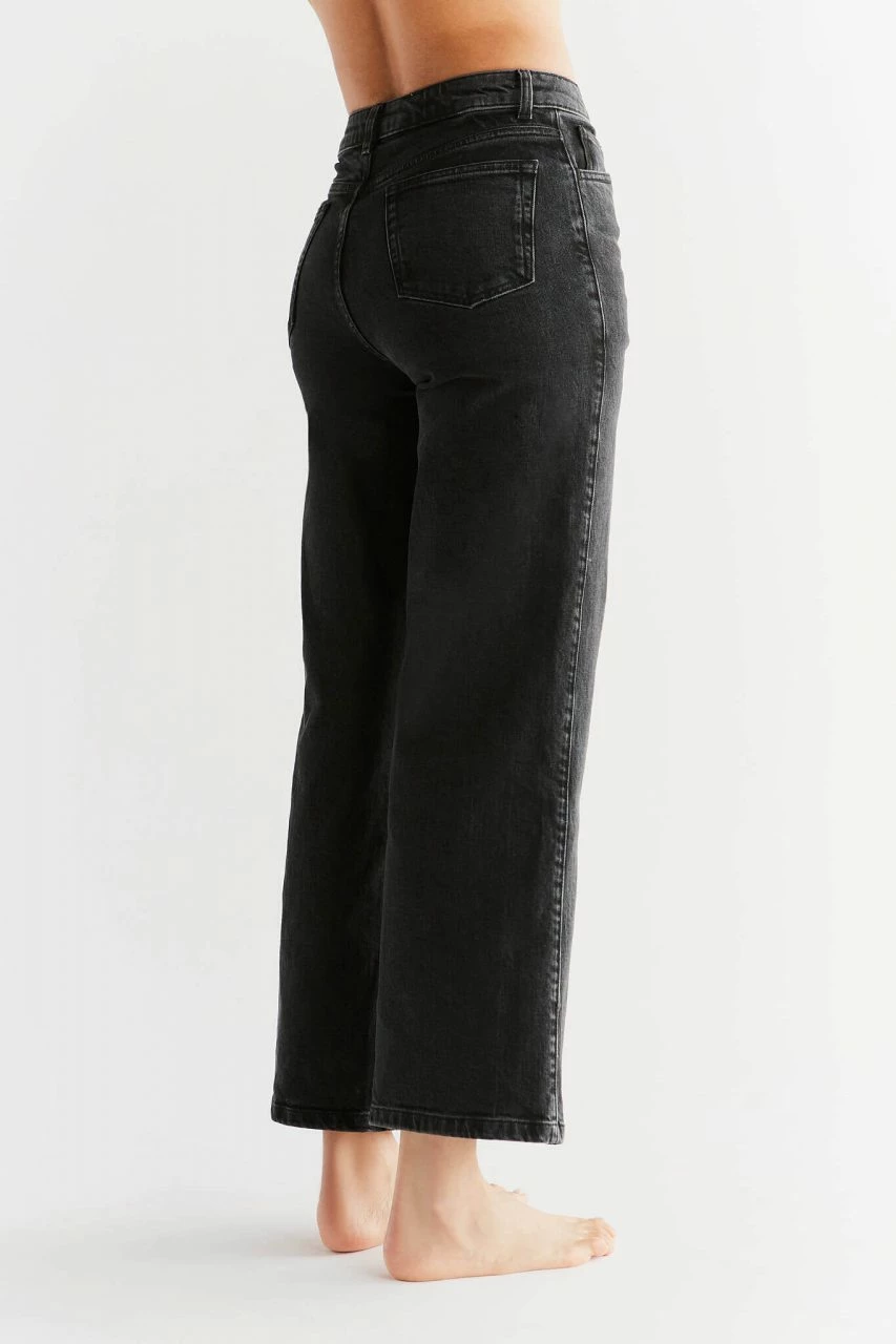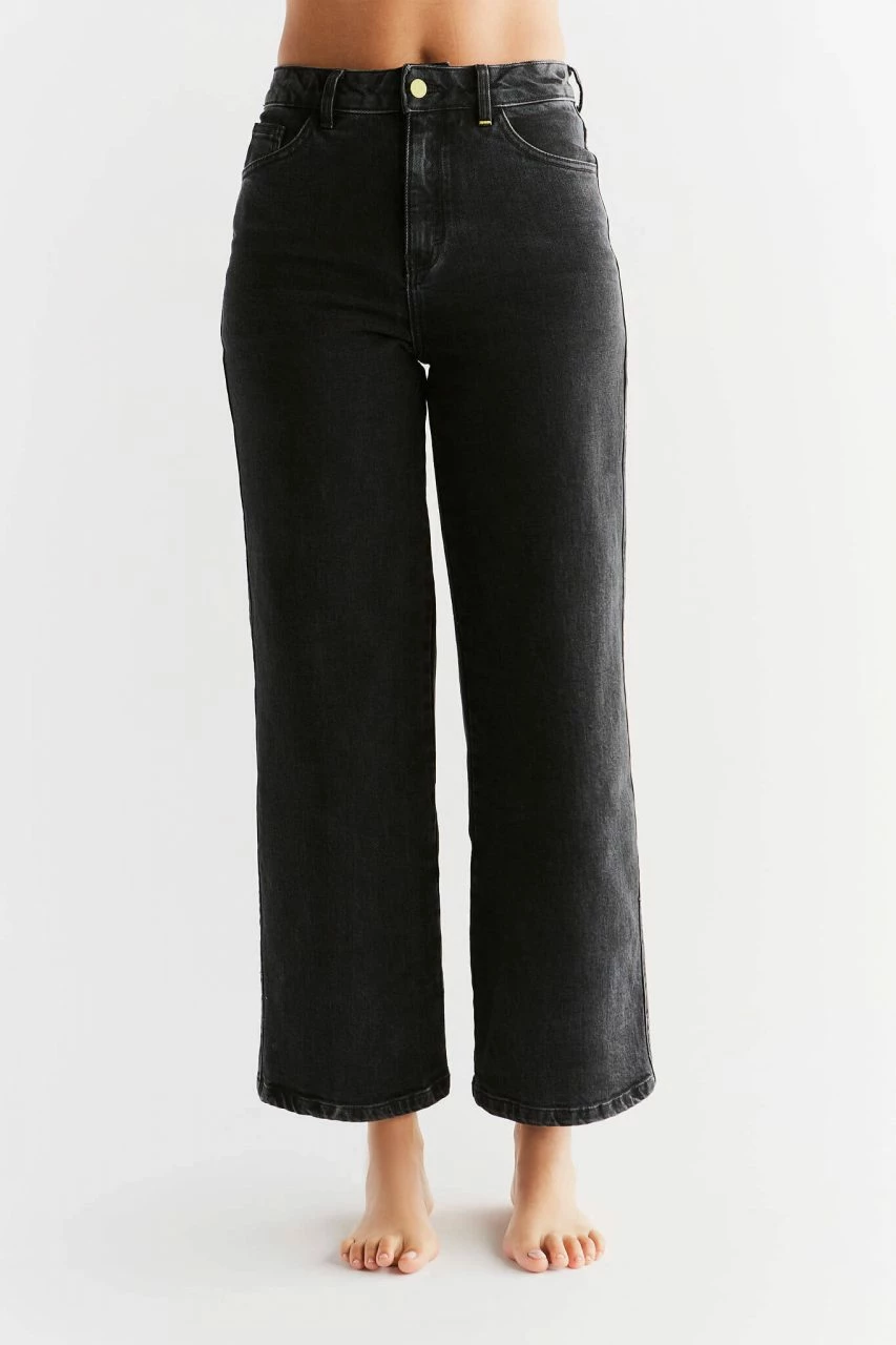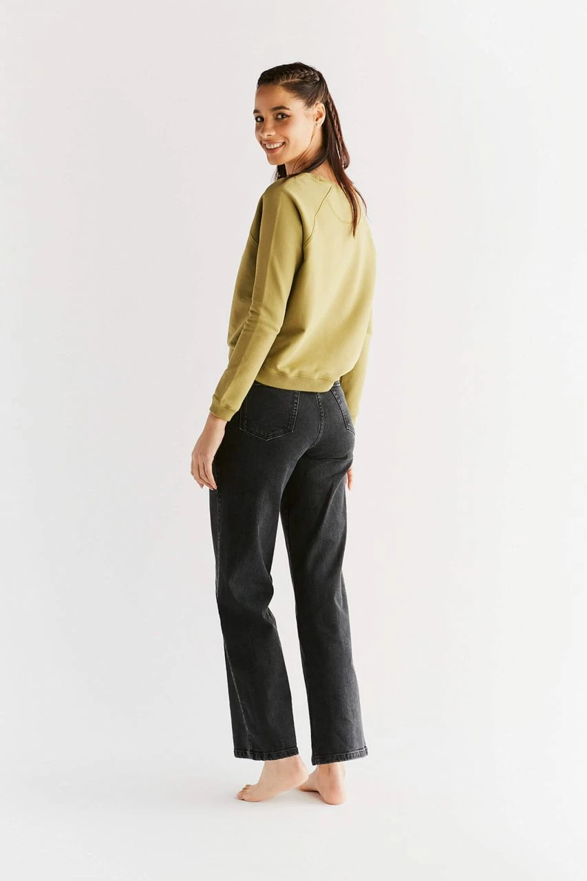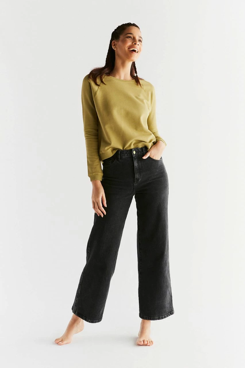 Weit geschnittene Damen Jeans aus nachhaltigen Materialien. Das Hosenbein sitzt lockerer und wird nach unten hin weiter, so bietet die Hose hohen Tragekomfort und viel Bewegungsfreiheit. Die Wide Leg Jeans präsentiert sich in einem cleanen Look komplett ohne Nieten oder Patches. Geschlossen wird die Hose mit einem matt schimmernden, gelben Knopf und YKK NATULON® Zipper aus recyceltem Polyester. Das Nähgarn besteht ebenfalls aus wiederverwertetem Polyester (Coats Epic EcoVerde).